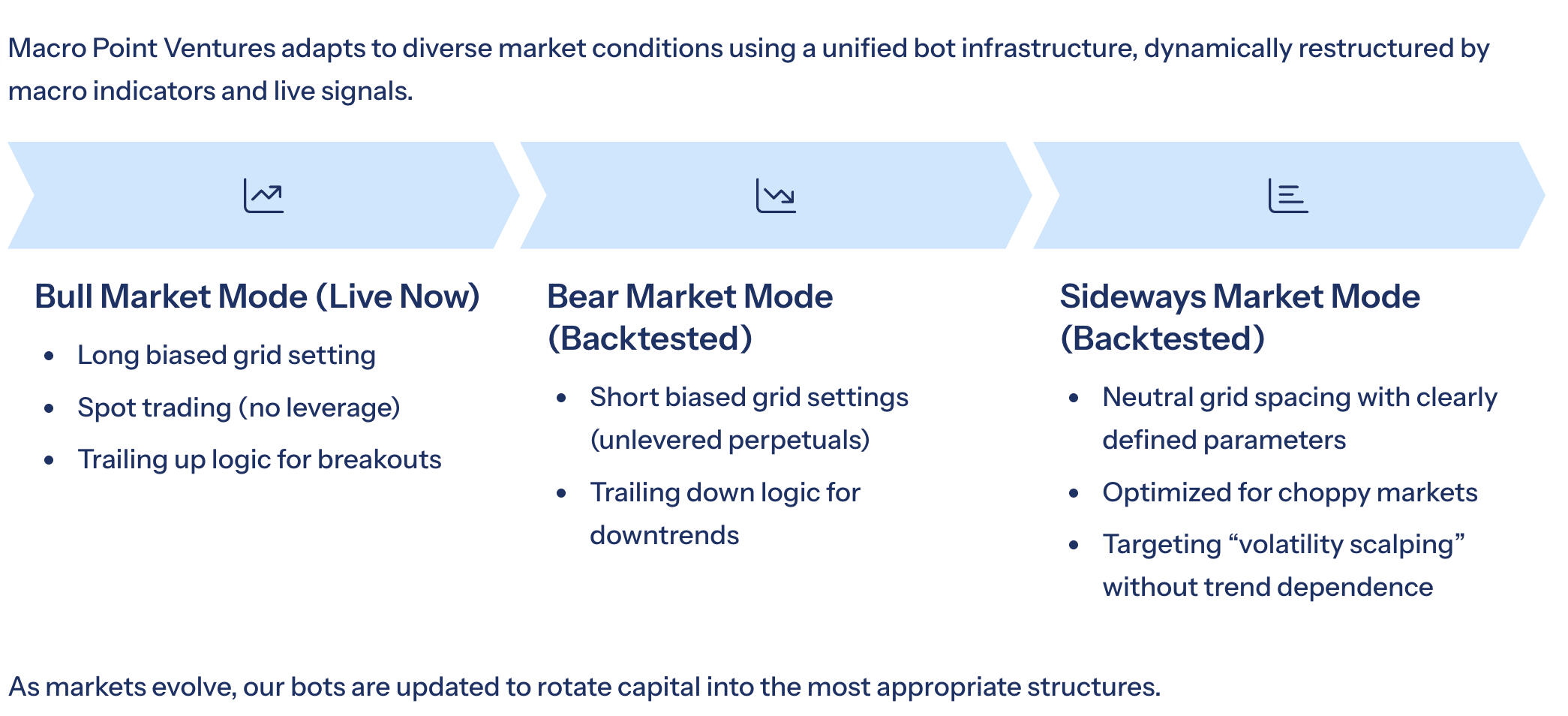 Profit from Volatility, Not DirectionGrid trading is a rules based strategy that places buy and sell orders at predefined interval, forming a “grid" around the current price. As the asset moves, the algorithm sells at higher prices and buys back lower, locking in small profits each time. This allows us to extract consistent yield without relying on predicting market direction beyond macro indicators.Grid trading thrives in the 24/7, volatile world of crypto, where volatility is the norm, not the exception.- Market Agnostic - Thrives in sideways, volatile, or choppy markets.